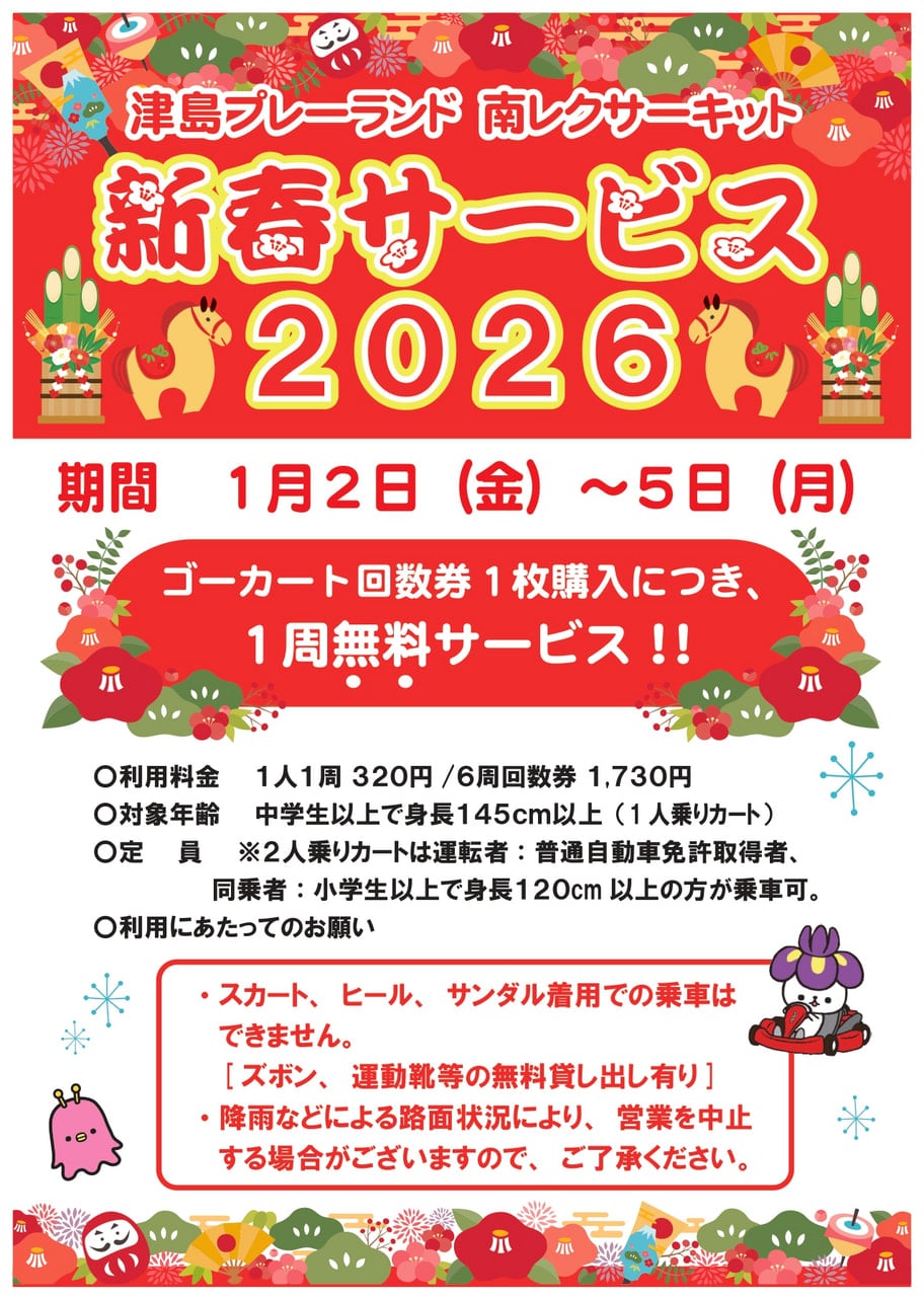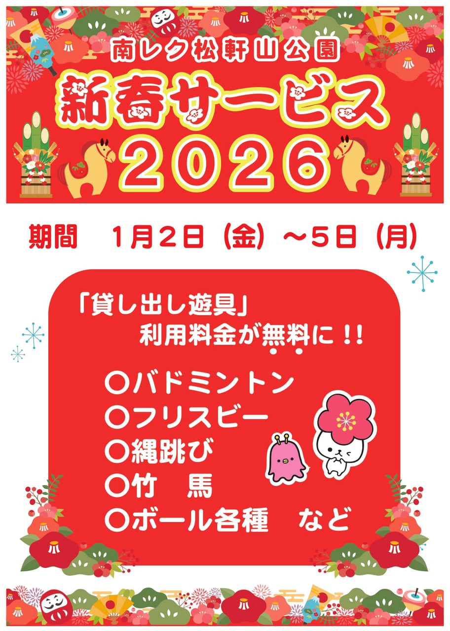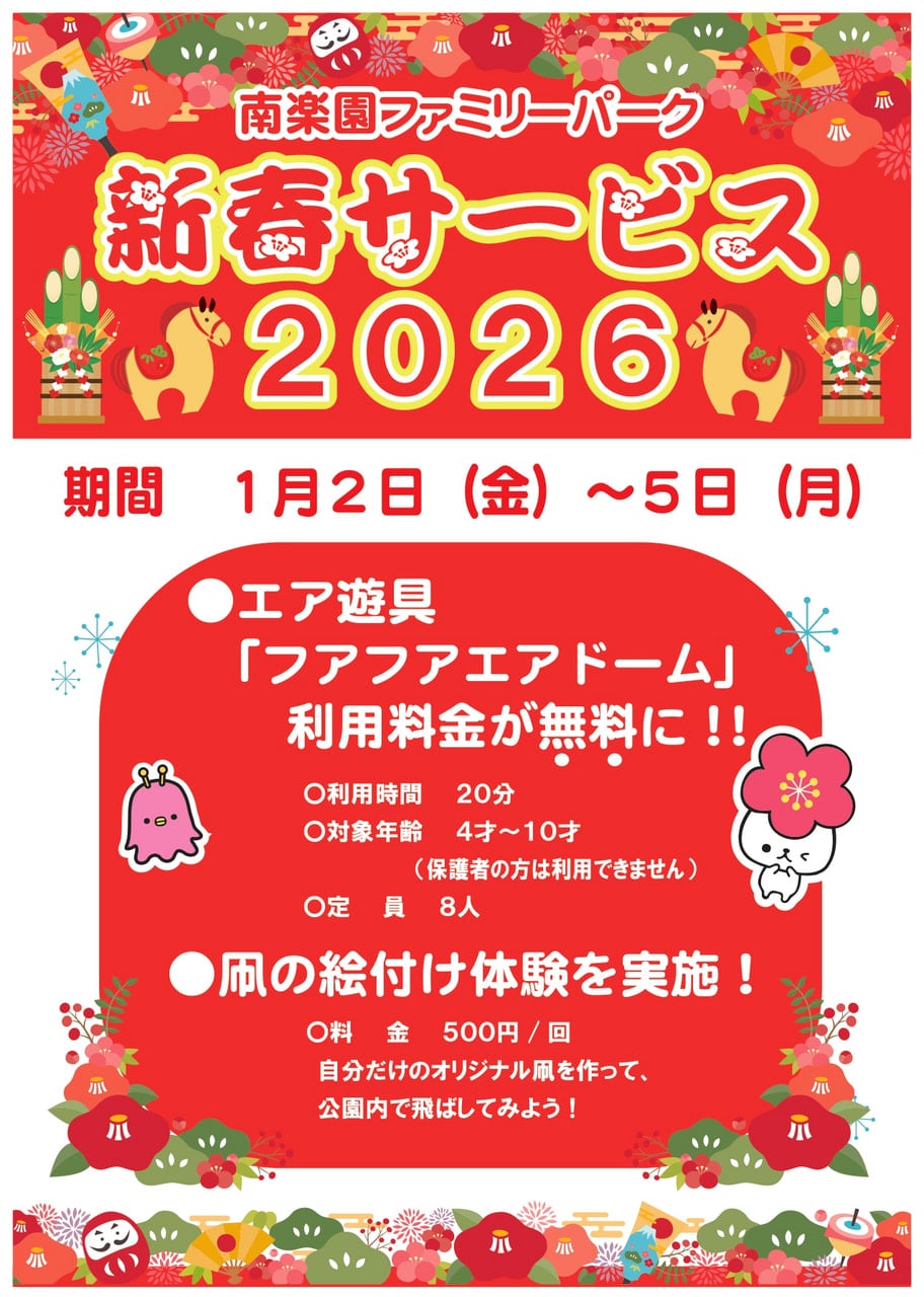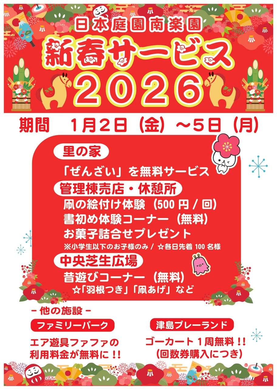 【1/2-5】🐎南楽園幸迎祭-新春サービスデー2026-🎍 2025年12月30日(火曜日) お知らせ 2026年1月2日(金)~5日(月)まで、 南楽園および、南楽園ファミリーパーク・津島プレーランド・松軒山公園で新春のサービスを行います♬ あったか~いぜんざいや、昔ながらのお正月遊びなどなど‥‥! たくさんのサービスを実施予定です! 皆さまぜひ、この機会に南楽園や各施設で新年の訪れを感じてみませんか? お知らせ一覧