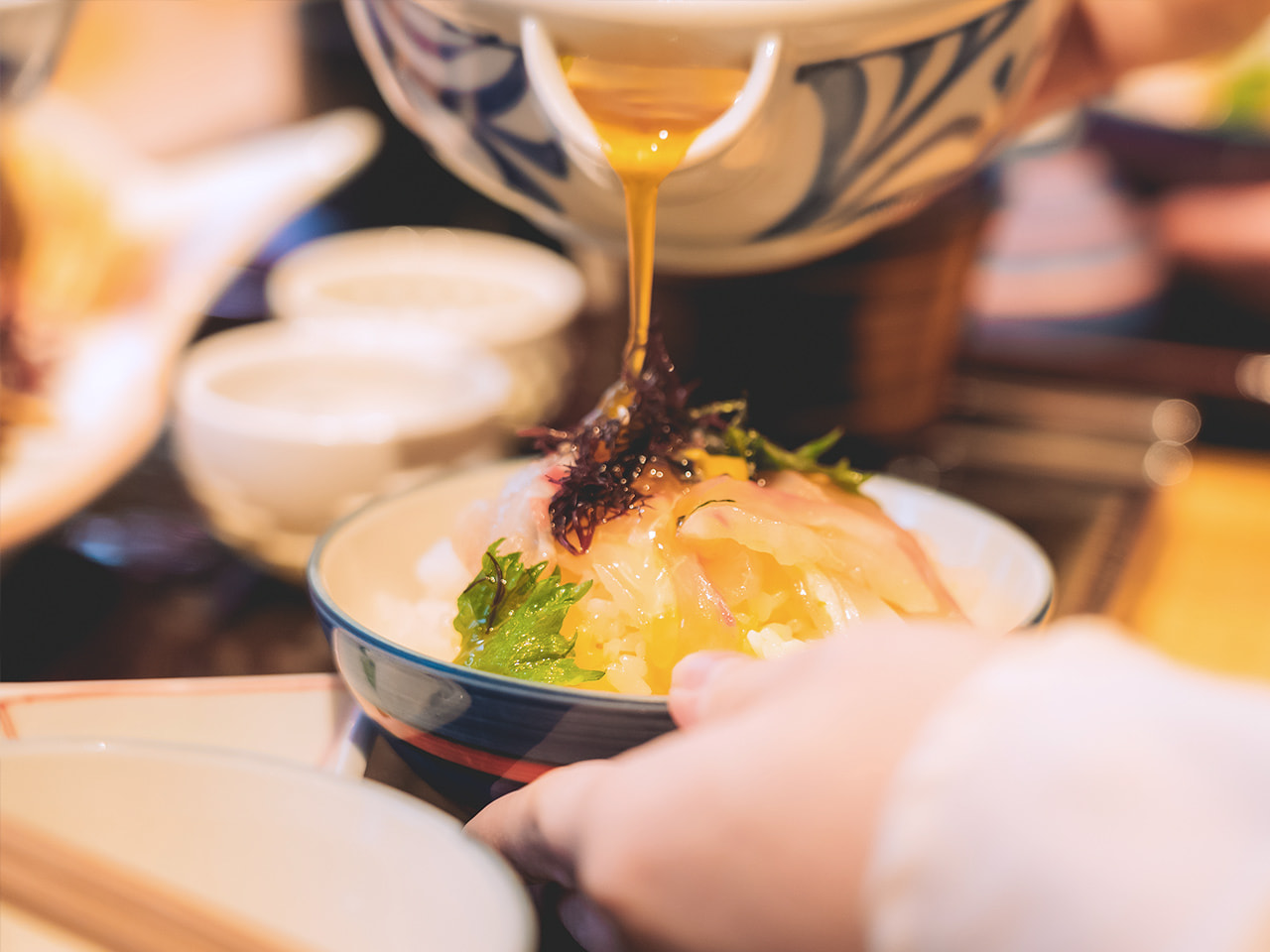 日本庭園の中にひっそりと佇み、四季折々の旬の美味と市場直送の宇和海の恵みが味わえます。庭園側に大きくとった窓越しに、日本庭園の移り行く美しい景観を望みながら、新鮮な真鯛の刺身を使用した和日輔 別邸 一押しの郷土料理「宇和島鯛めし」をじっくりと満喫できます。